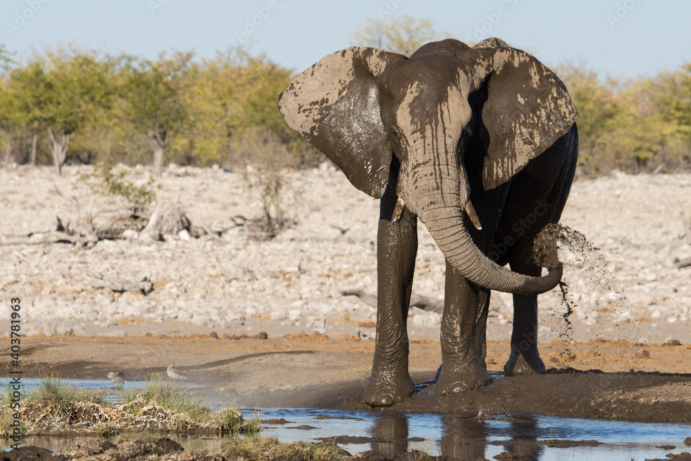 Wet African Elephant Playing And Splashing Mud With His Trunk On His Side At A Waterhole In Etosha National Park Namibia Stock Photo Adobe Stock